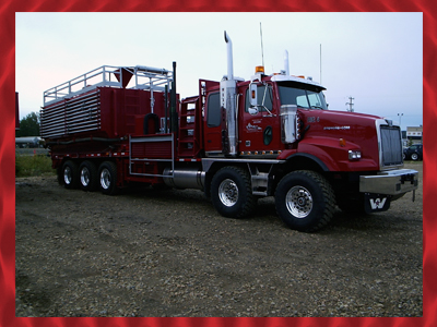 Tandom steer - Tri-Drive 60 Series engine, 5860 Allison Transmission. 72 ft mast rated for 140,000 lbs (62.3daN) 4 line. Cooper 42x12 drawworks. 3000m of 9/16 sand line. |